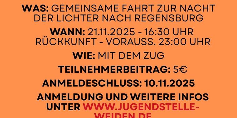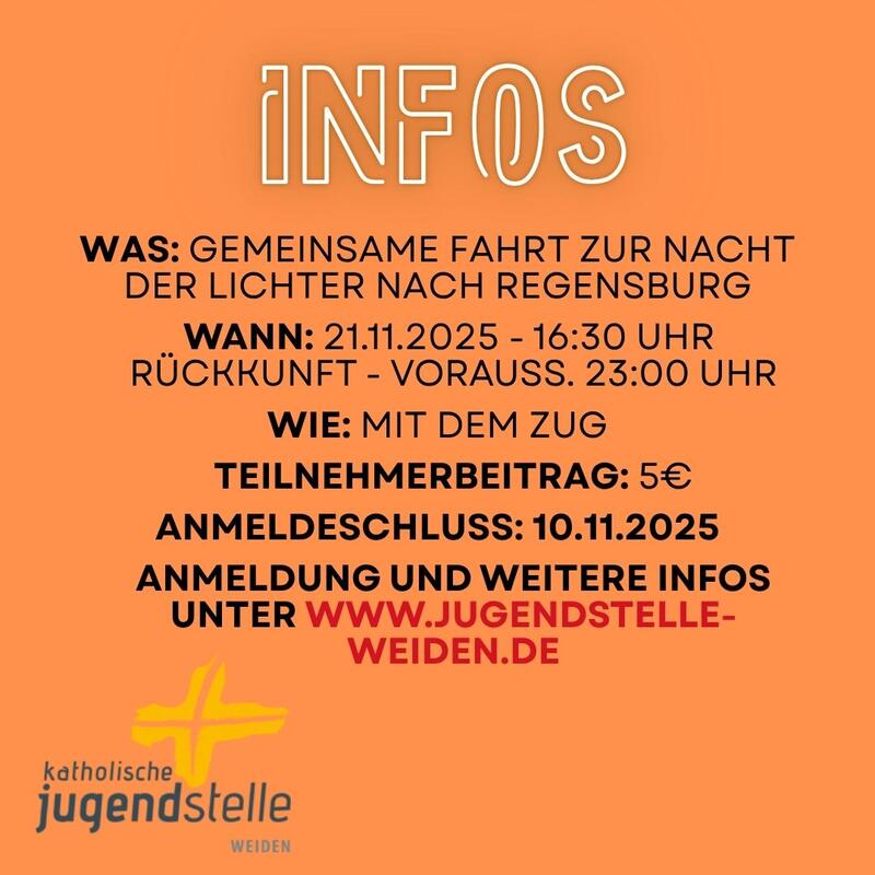 Am 21.11.2025 macht sich das Dekanat Neustadt-Weiden auf nach Regensburg. Treffpunkt ist um 16:30 Uhr am Bahnhofsvorplatz in Weiden. Die Rückkunft wird voraussichtlich um 23:00 Uhr sein.